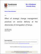 - ItemEffect of strategic change management practices on service delivery at the directorate of immigration of Kenya(Strathmore University, 2023) Opar, G. A.Occasioned by mounting outcry from an increasingly enlightened citizenry, the Kenyan government, as with other public administrations, has in the recent past resorted to reforms under the new public management dispensation. This was aimed at advancing an enhanced service delivery. In the immigration department, a number of service improvements and technological innovations have particularly been introduced in an effort to improve customer experience. It however remains unexplored in the Kenyan body of knowledge, the effect of these strategic change management practices on service delivery, presenting a knowledge gap. The study thus sought to examine the effect of strategic change management practices on service delivery at the Directorate of Immigration Services. More specifically, the study sought to establish the effect of strategic employee participation on service delivery at the Directorate of Immigration Services of Kenya; to determine the effect of strategic corporate communication on service delivery at the Directorate of Immigration Services of Kenya; and to establish the effect of strategic leadership on service delivery at the Directorate of Immigration Services of Kenya. This study employed a descriptive research design. The study targeted 168 senior, middle and operational level staff from the Directorate of Immigration Services headquarters in Nairobi, Kenya. The determined sample size was 118, which were proportionately distributed across the three job cadres. Questionnaires that are structured in design was used to gather information from study participants. Data analysis was then conducted using both descriptive and inferential statistics. This served to provide a general impression of where a majority of respondents lies with regard to the questionnaire items as well as the statistical association between the independent and dependent variables. Strategic employee participation, strategic corporation participation and strategic leadership are significantly associated with service delivery at the Directorate of Immigration Services of Kenya. This implies that a notable proportion of the variance in service delivery at the Directorate of Immigration Services of Kenya is attributed to strategic corporation participation. The study recommends that in order to realize superior service delivery in the management of change among government institutions, public administrations ought to actively involve lower cadre employees in a joint decision making and collective bargaining manner. It is also recommended that public administrations carry out strategic corporate communication in a manner that reduces employee anxiety, through established internal communication channels. It is further recommended that administrative leadership in government institutions provide support, direction, and motivation during the management of change.