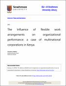 - ItemThe Influence of flexible work arrangements on organizational performance: a case of multinational corporations in Kenya(Strathmore University, 2023) Mwasaru, N.In the current global work environment, there is intense competition for talented employees and for market share based on advanced technology, higher product quality and lower prices in order to realize strategic advantage and organizational performance. A flexible working environment provides employees with a balance between their personal and professional lives, resulting in job satisfaction and better performance and an overall development of the organization in its entirety. Flexible work arrangements (FWA) can be defined in terms of flexibility in number of hours worked, flexibility in location and flexibility in work programming. This study conceptualized flexible work arrangements as flexible working hours, flexible working scheduling and remote working. While research has been conducted correlating FWA to organizational performance, study approaches, concepts and contexts adopted vary. This study thus attempted to fill this gap by investigating the influence of flexible work arrangements on organizational performance of multinational corporations in Kenya. The study pegged its variables on two key theories; underpinning flexible work arrangements, this study used the self-determination theory and underpinning organizational performance, the resource-based view. This study was based on positivism research philosophy and utilized descriptive cross-sectional survey design. The study population consisted of the 226 MNCs in Nairobi and purposive sampling was used to determine the respondents in 143 MNCs, who were managers in charge of either Human Resource Management or Finance. A structured closed-ended questionnaire was used for data collection. The data was analysed in SPSS and then analysed using descriptive and inferential statistics. Results were presented in form of graphs and tables. The results of this study established that flexible working hours and flexible work schedules do not have an influence on the performance of MNCs in Kenya but remote working has a weak influence on organizational performance. The findings of this study are expected to guide key stakeholders such as labour organizations and government agencies to formulate and implement labour policies regarding FWA practices that guide and support employees’ ability to work from any location of their choosing. The leadership of corporations, guided by the findings of this study, will be able to identify employees' flexible work arrangement practices needs, create practical solutions, and implement these practices to be able to achieve corporate goals and objectives. The study results add onto the existing literature on the relationship between remote working and organizational performance and contribute to the theories of resource-based view and self-determination. The study was limited to MNCs in Nairobi Kenya, while the response rate was hampered by the electioneering period of 2022 and restrictions of Covid-19 at that time.